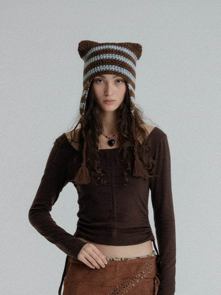 HANDCRAFT STRIPE CAT EARFLAP BROWN